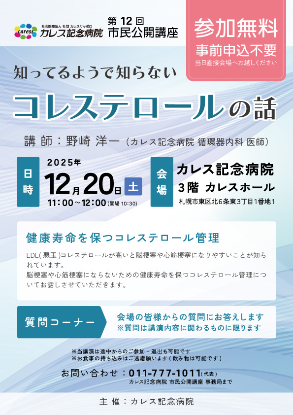 ホーム 新着情報 市民公開講座 開催のご案内 2025. 12.08 お知らせ 第12回 市民公開講座 第12回 市民公開講座「知ってるようで知らない コレステロールの話」開催のご案内 日時 令和7年12月20日(土)11:00~11:50(開場10:30) ※当日正面玄関の開錠は10:30からとなります。お早めに到着されました場合は病院外エントランスでお待ちください。 会場 カレス記念病院 3階 カレスホール(札幌市東区北6条東3丁目1-1) 講師 野崎 洋一(カレス記念病院 循環器内科 医師) 参加費 無料 ※事前申込は不要です。当日直接会場へお越しください。(途中からのご参加・退出も可能です) ※お食事の持ち込みはご遠慮願います(飲み物は可能です) ※地下駐車場をご利用の方は駐車料金1時間分を補助いたします。会場受付に駐車券をご提示ください。 主催 カレス記念病院 お問い合わせ先 TEL:011-777-1011(代表) カレス記念病院 市民公開講座事務局 まで 講演会終了後、会場の皆様からの質問にお答えします ※質問は講演内容に関わるものに限ります 市民公開講座 今後の開催スケジュール ※スケジュールや内容は変更になる場合があります 日程 テーマ 講師 1/10 災害発生から最初の1分 あなたは動けますか? 鈴木 貫太(カレス記念病院 院内救命士) 1/17 見つけて、治す。内視鏡診療の最前線胃がんでいのちをおとさないために 田沼 徳真(カレス記念病院 消化器内科 次席副院長・部長)浅香 正博(カレス記念病院 院長) 1/31 一向に良くならない腰痛 ~整形外科医による裏話~ 濱田 修人(カレス記念病院 整形外科 科長・副センター長) 2/14 知ってるようで知らない狭心症・心筋梗塞のはなし 野崎 洋一(カレス記念病院 循環器内科 医師) 2/21 筋肉を守り健康寿命を延ばすために知っておきたいサルコペニアとフレイルの話 武田 宏司(カレス記念病院 消化器内科 NST)田村 美香(カレス記念病院 栄養科 NST)小田 猛(カレス記念病院 理学療法科 NST) 2/28 もっと知ってほしい 緩和ケア 永縄 由美子(カレス記念病院 緩和ケア科 医長) 3/21 テーマ未定 諌山 幸弘(カレス記念病院 脳神経外科 医師)