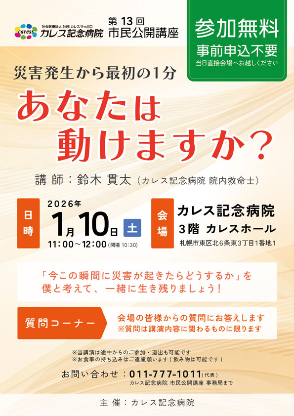 ホーム 新着情報 市民公開講座 開催のご案内 2025. 12.15 お知らせ 第13回 市民公開講座 第13回 市民公開講座「災害発生から最初の1分 あなたは動けますか?」開催のご案内 日時 令和8年1月10日(土)11:00~12:00(開場10:30) ※当日正面玄関の開錠は10:30からとなります。お早めに到着されました場合は病院外エントランスでお待ちください。 会場 カレス記念病院 3階 カレスホール(札幌市東区北6条東3丁目1-1) 講師 鈴木 貫太(カレス記念病院 院内救命士) 参加費 無料 ※事前申込は不要です。当日直接会場へお越しください。(途中からのご参加・退出も可能です) ※お食事の持ち込みはご遠慮願います(飲み物は可能です) ※地下駐車場をご利用の方は駐車料金1時間分を補助いたします。会場受付に駐車券をご提示ください。 主催 カレス記念病院 お問い合わせ先 TEL:011-777-1011(代表) カレス記念病院 市民公開講座事務局 まで 講演会終了後、会場の皆様からの質問にお答えします ※質問は講演内容に関わるものに限ります 市民公開講座 今後の開催スケジュール ※スケジュールや内容は変更になる場合があります 日程 テーマ 講師 1/17 見つけて、治す。内視鏡診療の最前線胃がんでいのちをおとさないために 田沼 徳真(カレス記念病院 消化器内科 次席副院長・部長)浅香 正博(カレス記念病院 院長) 1/31 一向に良くならない腰痛 ~整形外科医による裏話~ 濱田 修人(カレス記念病院 整形外科 科長・副センター長) 2/14 知ってるようで知らない狭心症・心筋梗塞のはなし 野崎 洋一(カレス記念病院 循環器内科 医師) 2/21 筋肉を守り健康寿命を延ばすために知っておきたいサルコペニアとフレイルの話 武田 宏司(カレス記念病院 消化器内科 NST)田村 美香(カレス記念病院 栄養科 NST)小田 猛(カレス記念病院 理学療法科 NST) 2/28 もっと知ってほしい 緩和ケア 永縄 由美子(カレス記念病院 緩和ケア科 医長) 3/21 テーマ未定 諌山 幸弘(カレス記念病院 脳神経外科 医師)