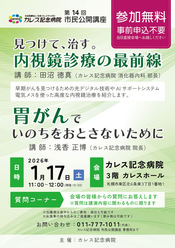 ホーム 新着情報 市民公開講座 開催のご案内 2025. 12.15 お知らせ 第14回 市民公開講座 第14回 市民公開講座開催のご案内 テーマ・講師 「見つけて、治す。内視鏡診療の最前線」講 師:田沼 徳真(カレス記念病院 消化器内科 部長) 「胃がんでいのちをおとさないために」講 師:浅香 正博(カレス記念病院 院長) 日時 令和8年1月17日(土)11:00~12:00(開場10:30) ※当日正面玄関の開錠は10:30からとなります。お早めに到着されました場合は病院外エントランスでお待ちください。 会場 カレス記念病院 3階 カレスホール(札幌市東区北6条東3丁目1-1) 参加費 無料 ※事前申込は不要です。当日直接会場へお越しください。(途中からのご参加・退出も可能です) ※お食事の持ち込みはご遠慮願います(飲み物は可能です) ※地下駐車場をご利用の方は駐車料金1時間分を補助いたします。会場受付に駐車券をご提示ください。 主催 カレス記念病院 お問い合わせ先 TEL:011-777-1011(代表) カレス記念病院 市民公開講座事務局 まで 講演会終了後、会場の皆様からの質問にお答えします ※質問は講演内容に関わるものに限ります 市民公開講座 今後の開催スケジュール ※スケジュールや内容は変更になる場合があります 日程 テーマ 講師 1/31 一向に良くならない腰痛 ~整形外科医による裏話~ 濱田 修人(カレス記念病院 整形外科 科長・副センター長) 2/14 知ってるようで知らない狭心症・心筋梗塞のはなし 野崎 洋一(カレス記念病院 循環器内科 医師) 2/21 筋肉を守り健康寿命を延ばすために知っておきたいサルコペニアとフレイルの話 武田 宏司(カレス記念病院 消化器内科 NST)田村 美香(カレス記念病院 栄養科 NST)小田 猛(カレス記念病院 理学療法科 NST) 2/28 もっと知ってほしい 緩和ケア 永縄 由美子(カレス記念病院 緩和ケア科 医長) 3/21 14の認知症リスク因子から考える正しい生き方 ~高齢死時代の善き寿命とは~ 諌山 幸弘(カレス記念病院 脳神経外科 医師)