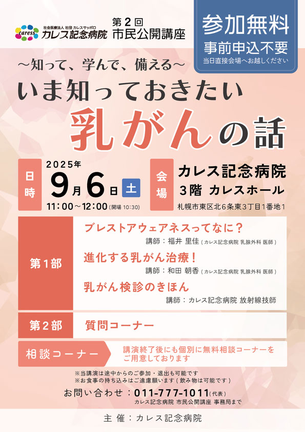 ホーム 新着情報 「~知って、学んで、備える~ いま知っておきたい乳がんの話」開催のご案内 2025. 08.18 お知らせ 第2回 市民公開講座 「~知って、学んで、備える~ いま知っておきたい乳がんの話」開催のご案内 日時 令和7年9月6日(土)11:00~11:50(開場10:30) ※当日 正面玄関の開錠は10:30からとなります。お早めに到着されました場合は病院外エントランスでお待ちください。 会場 カレス記念病院 3階 カレスホール(札幌市東区北6条東3丁目1-1) 講師 野崎 洋一(カレス記念病院 循環器内科 医師) 参加費 無料 ※事前申込は不要です。当日直接会場へお越しください。 (途中からのご参加・退出も可能です) ※お食事の持ち込みはご遠慮願います(飲み物は可能です) ※地下駐車場をご利用の方は駐車料金1時間分を補助いたします。会場受付に駐車券をご提示ください。 主催 カレス記念病院 お問い合わせ先 TEL:011-777-1011(代表) カレス記念病院 市民公開講座事務局 まで 講演会終了後、別ブースにて質問コーナーを設けます。 より詳しく知りたいことや不安な点など、どんなことでもお気軽にご質問ください。