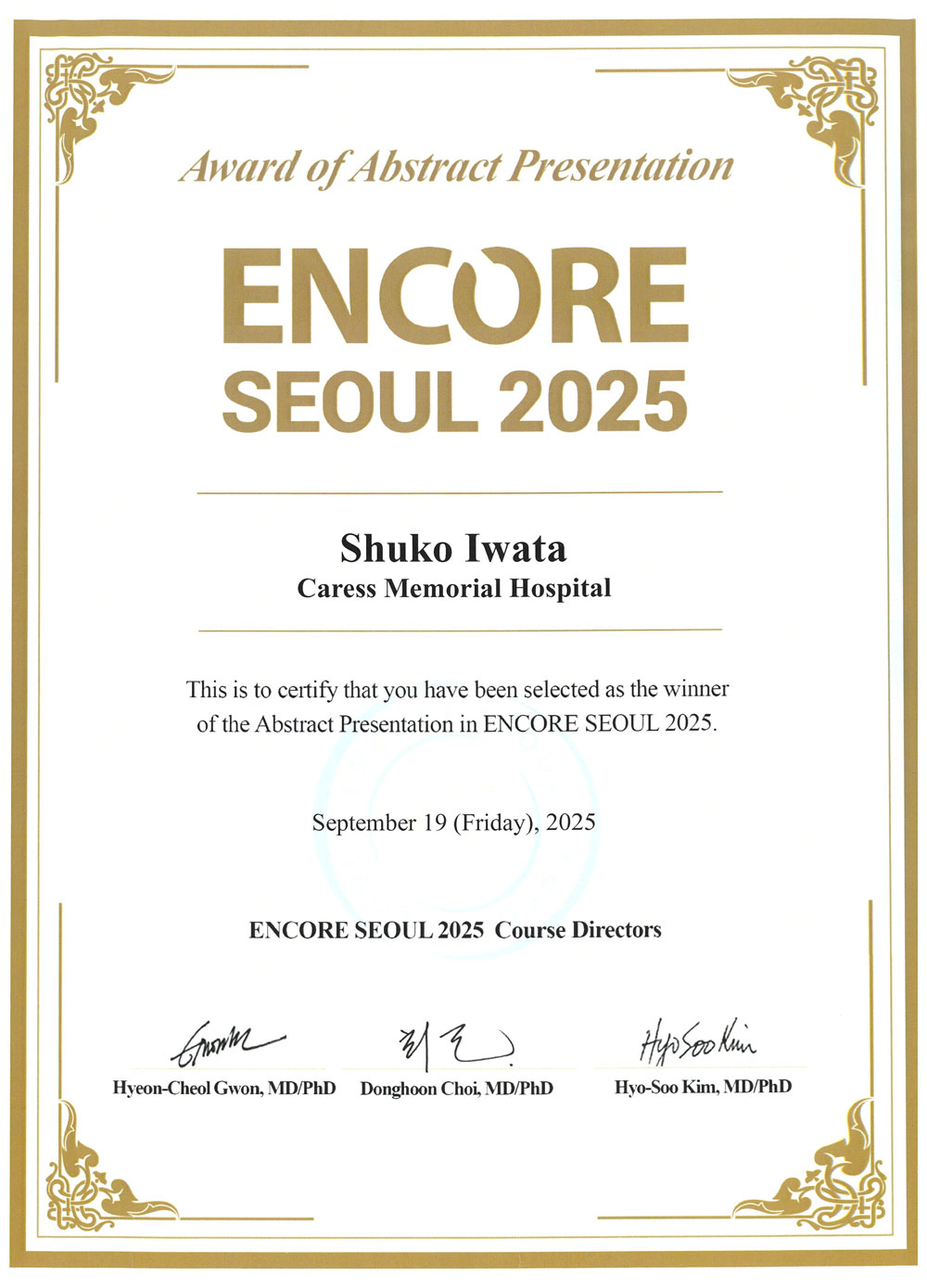 ホーム 新着情報 当院医師の発表がBest abstract awardに選ばれました 2025. 09.29 お知らせ 受賞報告 当院医師の発表がBest abstract awardに選ばれました 韓国で行われました国際学会ENCORE SEOUL 2025にて、当院循環器内科の岩田周耕医師の発表がBest abstract awardに選ばれました。