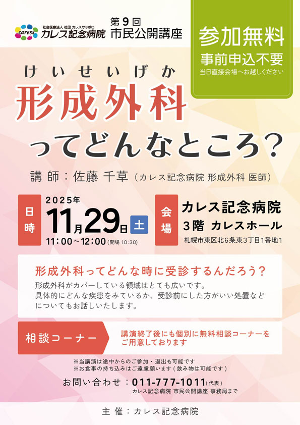 ホーム 新着情報 「形成外科ってどんなところ?」開催のご案内 2025. 11.17 お知らせ 第9回 市民公開講座 「形成外科ってどんなところ?」開催のご案内 日時 令和7年11月29日(土)11:00~11:50(開場10:30) ※当日正面玄関の開錠は10:30からとなります。お早めに到着されました場合は病院外エントランスでお待ちください。 会場 カレス記念病院 3階 カレスホール(札幌市東区北6条東3丁目1-1) 講師 佐藤 千草(カレス記念病院 形成外科 医師) 参加費 無料 ※事前申込は不要です。当日直接会場へお越しください。(途中からのご参加・退出も可能です) ※お食事の持ち込みはご遠慮願います(飲み物は可能です) ※地下駐車場をご利用の方は駐車料金1時間分を補助いたします。会場受付に駐車券をご提示ください。 主催 カレス記念病院 お問い合わせ先 TEL:011-777-1011(代表) カレス記念病院 市民公開講座事務局 まで 講演会終了後、別ブースにて質問コーナーを設けます。 より詳しく知りたいことや不安な点など、どんなことでもお気軽にご質問ください。 市民公開講座 今後の開催スケジュール ※スケジュールや内容は変更になる場合があります 日程 テーマ 講師 12/6 意外と知らないせきの話 鎌倉 栄作(カレス記念病院 呼吸器内科 科長) 12/13 あなたならどうする? 藤田 智(カレス記念病院 ERセンター 顧問) 12/20 知ってるようで知らない コレステロールの話 野崎 洋一(カレス記念病院 循環器内科 医師) 1/10 災害発生から最初の1分 あなたは動けますか? カレス記念病院 院内救命士 1/17 見つけて、治す。内視鏡診療の最前線胃がんでいのちをおとさないために 田沼 徳真(カレス記念病院 消化器内科 次席副院長・部長)浅香 正博(カレス記念病院 院長) 2/14 知ってるようで知らない狭心症・心筋梗塞のはなし 野崎 洋一(カレス記念病院 循環器内科 医師) 2/21 筋肉を守り健康寿命を延ばすために知っておきたいサルコペニアとフレイルの話 武田 宏司(カレス記念病院 消化器内科 NST)田村 美香(カレス記念病院 栄養科 NST)小田 猛(カレス記念病院 理学療法科 NST) 2/28 もっと知ってほしい 緩和ケア 永縄 由美子(カレス記念病院 緩和ケア科 医長) 3/21 テーマ未定 諌山 幸弘(カレス記念病院 脳神経外科 医師)