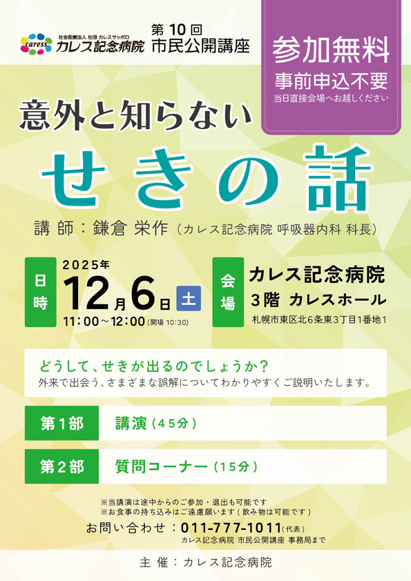 ホーム 新着情報 第10回 市民公開講座 開催のご案内 2025. 11.25 お知らせ 第10回 市民公開講座 第10回 市民公開講座「意外と知らないせきの話」開催のご案内 日時 令和7年12月6日(土)11:00~11:50(開場10:30) ※当日正面玄関の開錠は10:30からとなります。お早めに到着されました場合は病院外エントランスでお待ちください。 会場 カレス記念病院 3階 カレスホール(札幌市東区北6条東3丁目1-1) 講師 鎌倉 栄作(カレス記念病院 呼吸器内科 科長) 参加費 無料 ※事前申込は不要です。当日直接会場へお越しください。(途中からのご参加・退出も可能です) ※お食事の持ち込みはご遠慮願います(飲み物は可能です) ※地下駐車場をご利用の方は駐車料金1時間分を補助いたします。会場受付に駐車券をご提示ください。 主催 カレス記念病院 お問い合わせ先 TEL:011-777-1011(代表) カレス記念病院 市民公開講座事務局 まで 市民公開講座 今後の開催スケジュール ※スケジュールや内容は変更になる場合があります 日程 テーマ 講師 12/13 あなたならどうする? 藤田 智(カレス記念病院 ERセンター 顧問) 12/20 知ってるようで知らない コレステロールの話 野崎 洋一(カレス記念病院 循環器内科 医師) 1/10 災害発生から最初の1分 あなたは動けますか? 鈴木 貫太(カレス記念病院 院内救命士) 1/17 見つけて、治す。内視鏡診療の最前線胃がんでいのちをおとさないために 田沼 徳真(カレス記念病院 消化器内科 次席副院長・部長)浅香 正博(カレス記念病院 院長) 1/31 一向に良くならない腰痛 ~整形外科医による裏話~ 濱田 修人(カレス記念病院 整形外科 科長・副センター長) 2/14 知ってるようで知らない狭心症・心筋梗塞のはなし 野崎 洋一(カレス記念病院 循環器内科 医師) 2/21 筋肉を守り健康寿命を延ばすために知っておきたいサルコペニアとフレイルの話 武田 宏司(カレス記念病院 消化器内科 NST)田村 美香(カレス記念病院 栄養科 NST)小田 猛(カレス記念病院 理学療法科 NST) 2/28 もっと知ってほしい 緩和ケア 永縄 由美子(カレス記念病院 緩和ケア科 医長) 3/21 テーマ未定 諌山 幸弘(カレス記念病院 脳神経外科 医師)