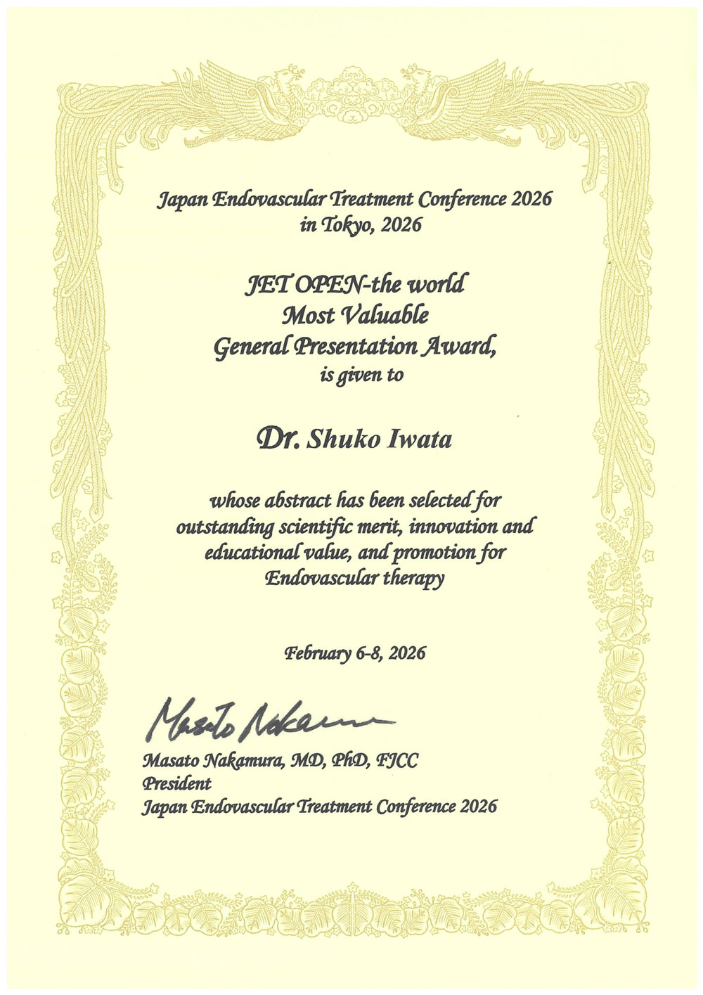 ホーム 新着情報 当院医師の発表が最優秀賞に選ばれました 2026. 02.12 お知らせ 受賞報告 当院医師の発表が最優秀賞に選ばれました 2026年2月6日から8日まで東京で行われましたJET2026にて、当院循環器内科の岩田周耕医師の発表がJET OPEN the World – Most Valuable Presentation Awardに選ばれました。 JET2026 Presentation Award