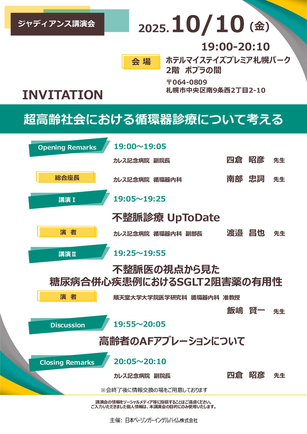 当院循環器内科の四倉昭彦医師・渡邉昌也医師・南部忠詞医師が医療者向け講演会に参加いたします。参加を希望される方は講演会詳細PDFをご確認ください。 日 時:令和7年10月10日(金)19:00~20:10 会 場:ホテルマイステイズプレミア札幌パーク 2階ポプラの間 (札幌市中央区南9条西2丁目2-10) 主 催:日本ベーリンガーインゲルハイム株式会社 講演会詳細 [PDF]